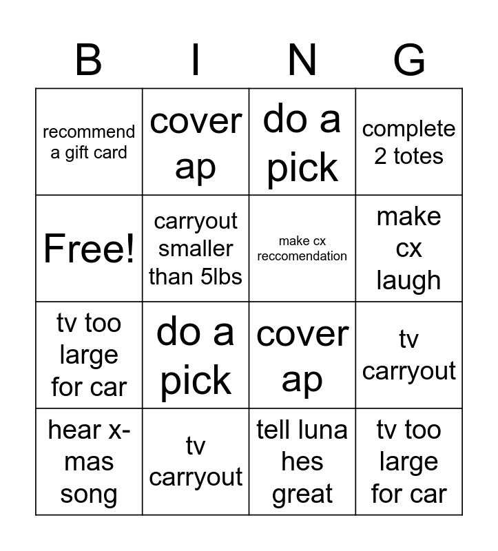This bingo card has 16 words: tv carryout, tv carryout, do a pick, recommend a gift card, tv too large for car, cover ap, cover ap, tell luna hes great, Free!, carryout smaller than 5lbs, hear x-mas song, complete 2 totes, do a pick, make cx laugh, make cx reccomendation and tv too large for car.