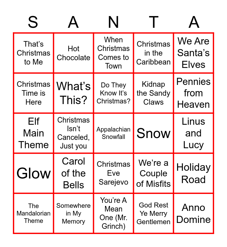 This bingo card has 32 words: The Mandalorian Theme, Die Hard Theme, Appalachian Snowfall, Snow/Heat Miser Song, Linus and Lucy, Christmas Time is Here, What’s This?, You’re A Mean One (Mr. Grinch), Kidnap the Sandy Claws, Christmas Canon, Elf Main Theme, Hot Chocolate, Dance of the Sugar Plum Fairy, God Rest Ye Merry Gentlemen, Pennies from Heaven, The Three Kings and I, Somewhere in My Memory, Do They Know It’s Christmas?, Snow, Holiday Road, Glow, Underneath the Tree, Christmas Eve Sarejevo, We’re a Couple of Misfits, We Are Santa’s Elves, That’s Christmas to Me, Christmas Isn’t Canceled, Just you, When Christmas Comes to Town, Christmas in the Caribbean, Anno Domine, 12 days of Christmas and Carol of the Bells.