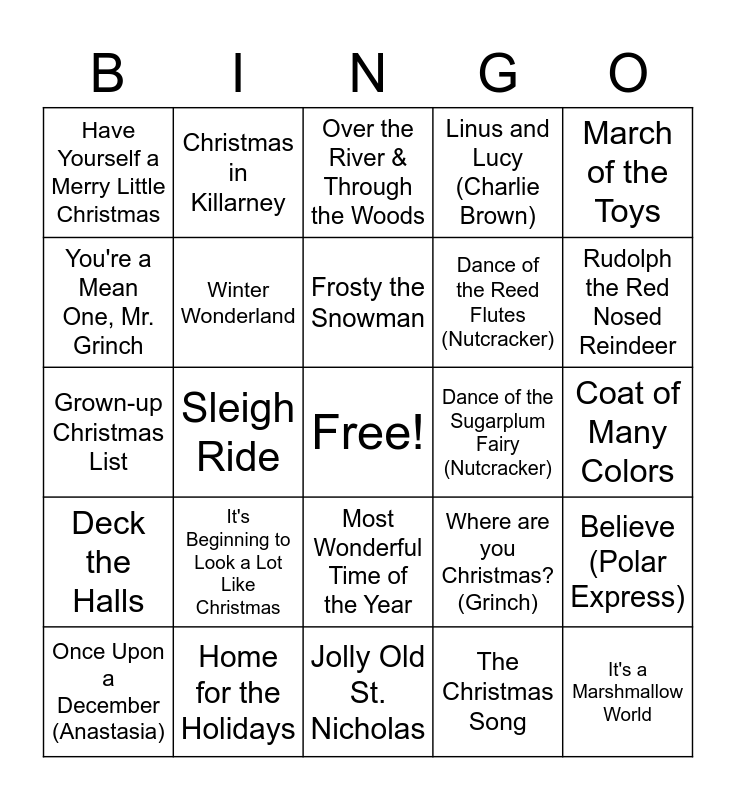 This bingo card has a free space and 32 words: The Christmas Song, Holly Jolly Christmas, Sleigh Ride, Skating (Charlie Brown), Deck the Halls, Winter Wonderland, March of the Toys, Believe (Polar Express), Christmas in Killarney, Jingle Bells, Frosty the Snowman, Over the River & Through the Woods, Santa Baby, White Christmas, Dance of the Sugarplum Fairy (Nutcracker), Somewhere in my Memory (Home Alone), Once Upon a December (Anastasia), Grown-up Christmas List, Most Wonderful Time of the Year, It's Beginning to Look a Lot Like Christmas, Where are you Christmas? (Grinch), We Need a Little Christmas (Mame), Coat of Many Colors, Home for the Holidays, It's a Marshmallow World, Linus and Lucy (Charlie Brown), Dance of the Reed Flutes (Nutcracker), You're a Mean One, Mr. Grinch, Have Yourself a Merry Little Christmas, Jolly Old St. Nicholas, Let It Snow and Rudolph the Red Nosed Reindeer.