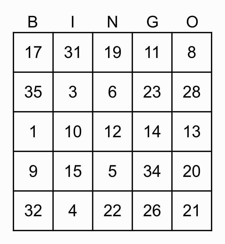 This bingo card has 41 words: Free!, 1, 2, 3, 4, 5, 6, 7, 8, 9, 10, 11, 12, 13, 14, 15, 16, 17, 18, 19, 20, 21, 22, 23, 24, 25, 26, 27, 28, 29, 30, 31, 32, 33, 34, 35, 36, 37, 38, 39 and 40.