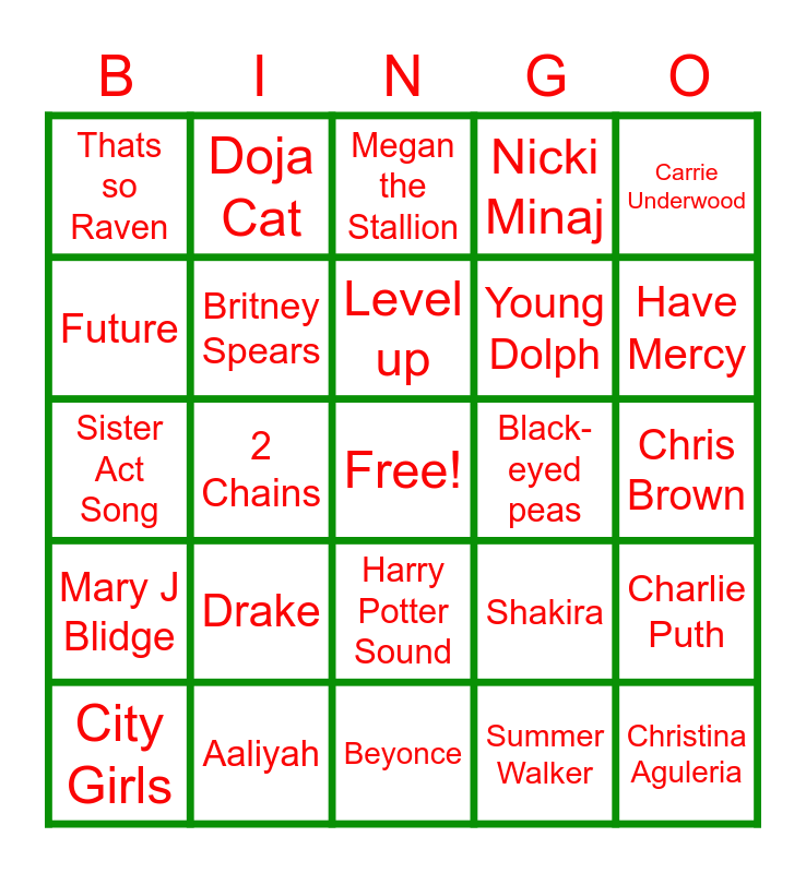 This bingo card has a free space and 25 words: Drake, Beyonce, Level up, City Girls, Carrie Underwood, Thats so Raven, Future, Doja Cat, Black-eyed peas, Harry Potter Sound, Young Dolph, Sister Act Song, Shakira, Charlie Puth, Britney Spears, Rihanna, Chris Brown, Megan the Stallion, Have Mercy, 2 Chains, Christina Aguleria, Aaliyah, Mary J Blidge, Nicki Minaj and Summer Walker.