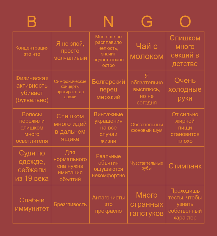 This bingo card has 25 words: Судя по одежде, себжали из 19 века, Брезгливость, Винтажные украшения на все случаи жизни, Много странных галстуков, Слишком много секций в детстве, Концентрация это что, Я не злой, просто молчаливый, Мне ещё не расплавило челюсть, значит недостаточно остро, Обязательный фоновый шум, Стимпанк, Физическая активность убивает (буквально), Симфонические концерты протирают до дрожи, Антагонисты это прекрасно, Чувствительные зубы, Очень холодные руки, Слабый иммунитет, Слишком много идей в дальнем ящике, Болгарский перец мерзкий, Я обязательно высплюсь, но не сегодня, От сильно жирной пищи становится плохо, Волосы пережили слишком много осветлителя, Для нормального сна нужна имитация объятий, Реальные объятия ощущаются некомфортно, Чай с молоком and Проходишь тесты, чтобы узнать собственный характер.