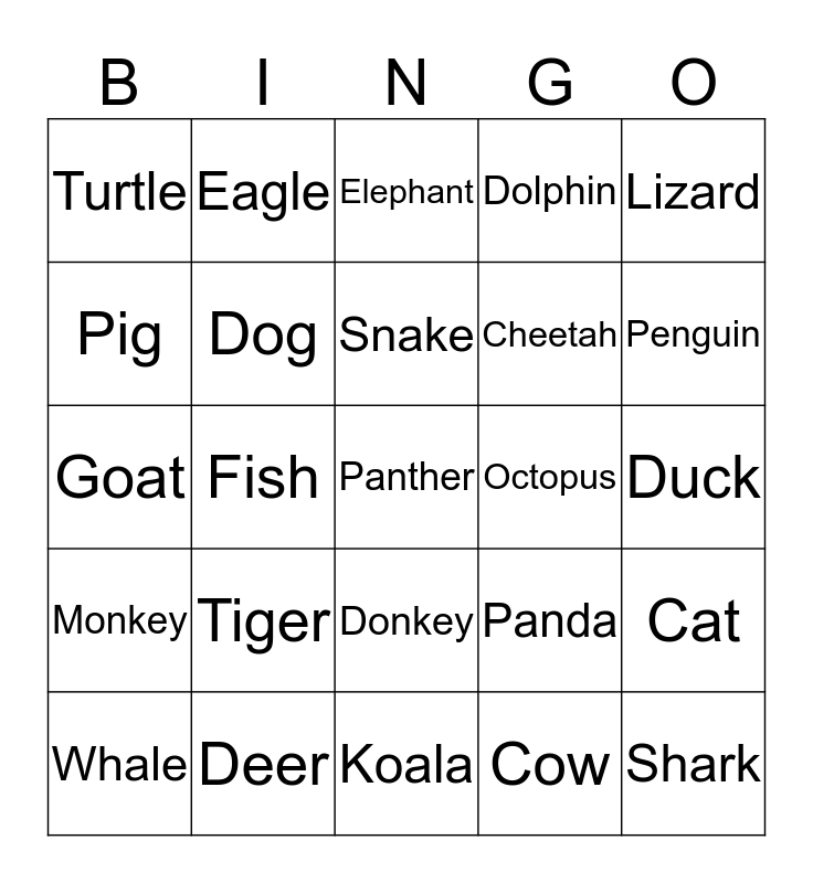 This bingo card has a free space and 24 words: Tiger, Deer, Snake, Whale, Lizard, Turtle, Pig, Eagle, Octopus, Donkey, Cheetah, Goat, Panda, Cat, Dog, Cow, Duck, Elephant, Penguin, Fish, Shark, Monkey, Dolphin and Koala.