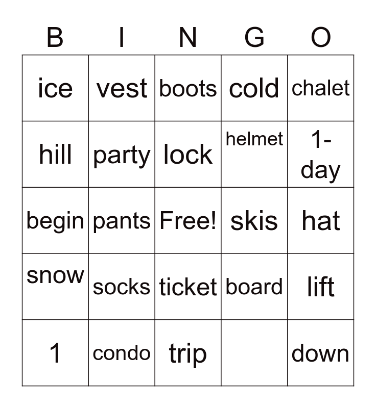 This bingo card has a free space and 25 words: snow, condo, trip, board, 1-day, ice, vest, boots, helmet, down, hill, party, Free, skis, hat, expert, pants, lock, cold, lift, begin, socks, ticket, chalet and 1.