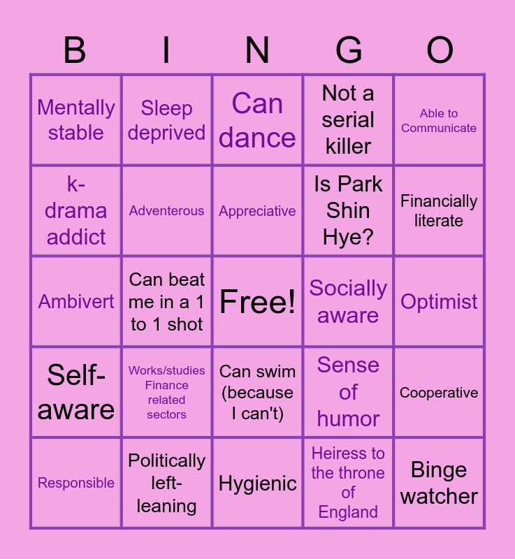 This bingo card has a free space and 24 words: Responsible, Works/studies Finance related sectors, Appreciative, Heiress to the throne of England, Able to Communicate, Mentally stable, Sleep deprived, Can dance, Socially aware, Optimist, Ambivert, Adventerous, Sense of humor, Cooperative, k-drama addict, Politically left-leaning, Hygienic, Not a serial killer, Financially literate, Self-aware, Can beat me in a 1 to 1 shot, Can swim (because I can't), Is Park Shin Hye? and Binge watcher.