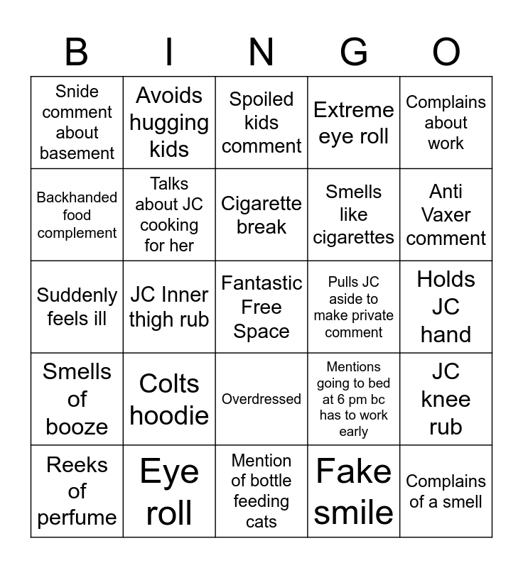 This bingo card has a free space and 24 words: Colts hoodie, Eye roll, Cigarette break, Reeks of perfume, Complains about work, Snide comment about basement, Backhanded food complement, Avoids hugging kids, Pulls JC aside to make private comment, Overdressed, Smells like cigarettes, Suddenly feels ill, Mentions going to bed at 6 pm bc has to work early, JC knee rub, Talks about JC cooking for her, Fake smile, Holds JC hand, Spoiled kids comment, Anti Vaxer comment, JC Inner thigh rub, Complains of a smell, Smells of booze, Extreme eye roll and Mention of bottle feeding cats.