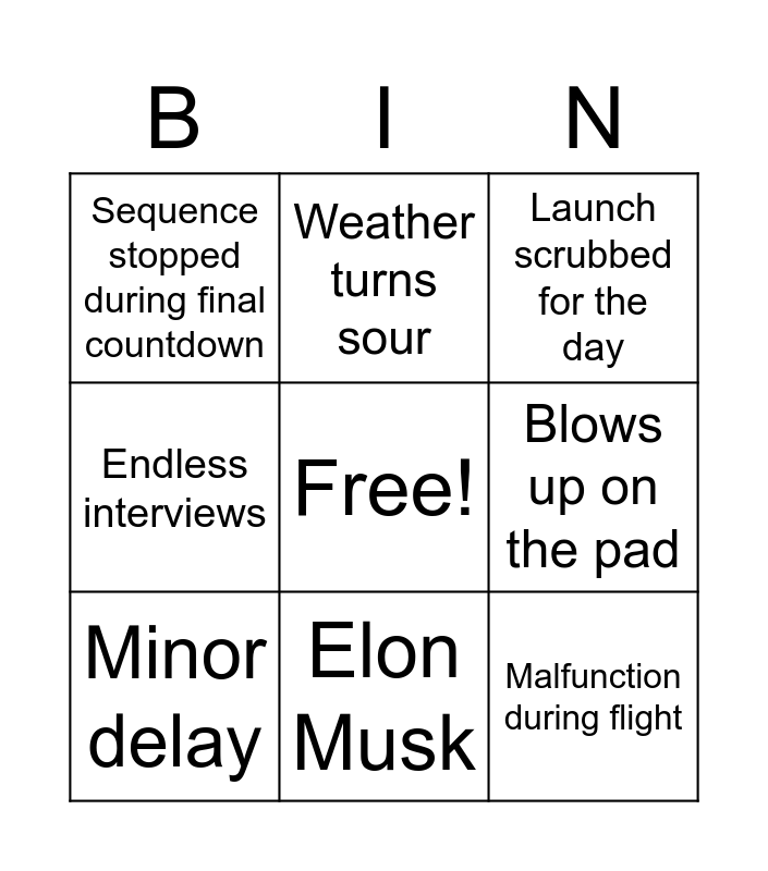 This bingo card has a free space and 8 words: Blows up on the pad, Launch scrubbed for the day, Weather turns sour, Minor delay, Sequence stopped during final countdown, Malfunction during flight, Endless interviews and Elon Musk.