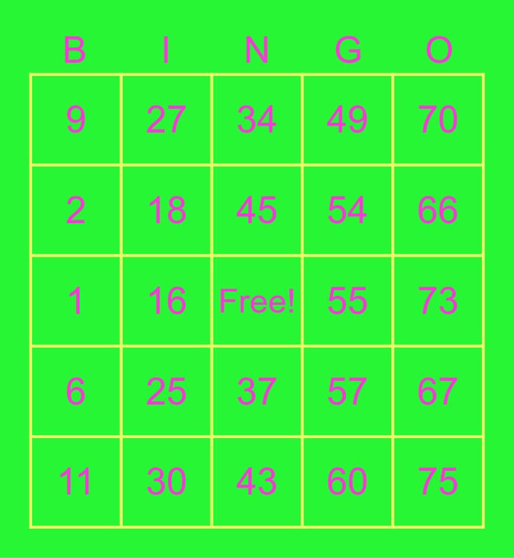 This bingo card has a free space and 24 words: 11, 25, 45, 60, 70, 9, 27, 34, 55, 73, 1, 18, 57, 67, 2, 30, 43, 49, 66, 6, 16, 37, 54 and 75.