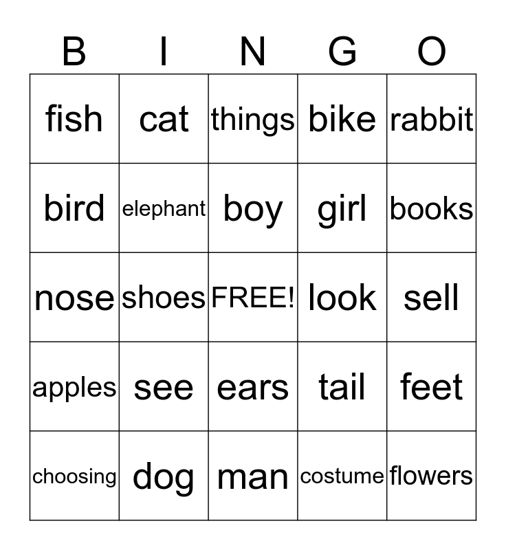This bingo card has a free space and 24 words: see, dog, boy, choosing, rabbit, fish, bird, cat, look, ears, girl, nose, tail, feet, elephant, costume, sell, things, books, shoes, flowers, apples, bike and man.