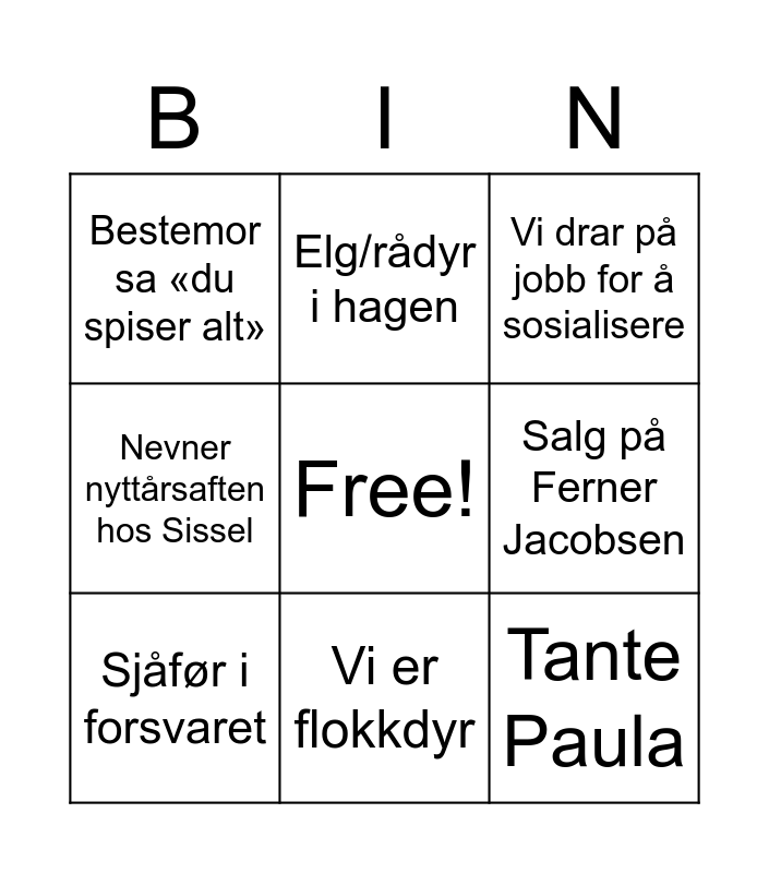 This bingo card has a free space and 10 words: Vi er flokkdyr, Vi drar på jobb for å sosialisere, Bestemor sa «du spiser alt», Tante Paula, Nevner nyttårsaften hos Sissel, Sjåfør i forsvaret, Elg/rådyr i hagen, Svineinfluensaen, Salg på Ferner Jacobsen and Stekte ribba i går og ble dødsbra.