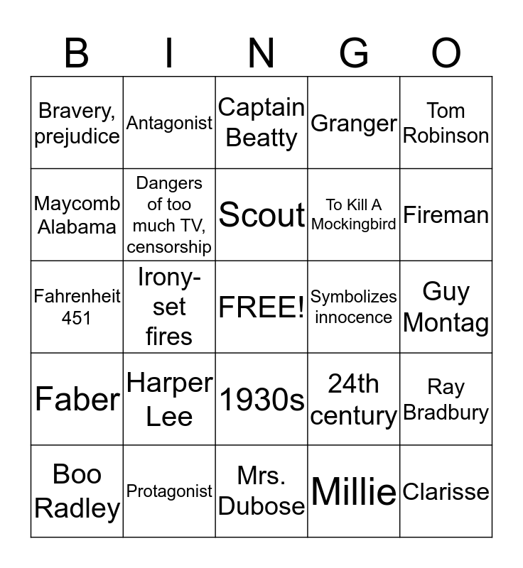 This bingo card has a free space and 24 words: Harper Lee, Protagonist, Scout, Boo Radley, Tom Robinson, Bravery, prejudice, Maycomb Alabama, Antagonist, Symbolizes innocence, 1930s, To Kill A Mockingbird, Fahrenheit 451, 24th century, Ray Bradbury, Dangers of too much TV, censorship, Millie, Guy Montag, Captain Beatty, Fireman, Irony-set fires, Clarisse, Faber, Granger and Mrs. Dubose.