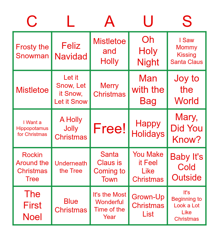 This bingo card has a free space and 51 words: Last Christmas, It's Beginning to Look a Lot Like Christmas, Jingle Bell Rock, It's the Most Wonderful Time of the Year, Underneath the Tree, Sleigh Ride, Feliz Navidad, Holly Jolly Christmas, Mistletoe, Wonderful Christmastime, Let it Snow, Let it Snow, Let it Snow, Oh Holy Night, Baby It's Cold Outside, You Make it Feel Like Christmas, Have Yourself a Merry Little Christmas, Like it's Christmas, Merry Christmas, Happy Holidays, White Christmas, I Saw Mommy Kissing Santa Claus, A Holly Jolly Christmas, Grown-Up Christmas List, Frosty the Snowman, Man with the Bag, The Christmas Song, Bring Me Love, Joy to the World, Do You Hear What I Hear?, The First Noel, Mistletoe and Holly, Rudolph the Red-Nosed Reindeer, One More Sleep, What Christmas Means to Me, Here Comes Santa Claus, Run Rudolph Run, Blue Christmas, Winter Wonderland, Believe, Little Drummer Boy, O Come All Ye Faithful, Mary, Did You Know?, Rockin Around the Christmas Tree, Carol of the Bells, You're a Mean One, Mr. Grinch, I'll be Home for Christmas, Someday at Christmas, I Want a Hippopotamus for Christmas, Santa Baby, Dance of the Sugarplum Fairy, Santa Claus is Coming to Town and All I Want for Christmas is You.