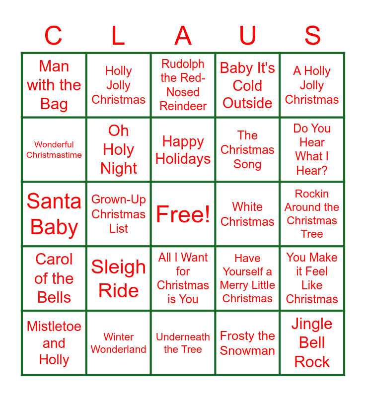 This bingo card has a free space and 51 words: It's Beginning to Look a Lot Like Christmas, Jingle Bell Rock, It's the Most Wonderful Time of the Year, Underneath the Tree, Sleigh Ride, Feliz Navidad, Holly Jolly Christmas, Mistletoe, Wonderful Christmastime, Let it Snow, Let it Snow, Let it Snow, Oh Holy Night, Baby It's Cold Outside, You Make it Feel Like Christmas, Have Yourself a Merry Little Christmas, Like it's Christmas, Merry Christmas, Happy Holidays, White Christmas, I Saw Mommy Kissing Santa Claus, A Holly Jolly Christmas, Grown-Up Christmas List, Frosty the Snowman, Man with the Bag, The Christmas Song, Bring Me Love, Joy to the World, Do You Hear What I Hear?, The First Noel, Mistletoe and Holly, Rudolph the Red-Nosed Reindeer, One More Sleep, What Christmas Means to Me, Here Comes Santa Claus, Run Rudolph Run, Blue Christmas, Winter Wonderland, Believe, Little Drummer Boy, O Come All Ye Faithful, Mary, Did You Know?, Rockin Around the Christmas Tree, Carol of the Bells, You're a Mean One, Mr. Grinch, I'll be Home for Christmas, Someday at Christmas, I Want a Hippopotamus for Christmas, Santa Baby, Dance of the Sugarplum Fairy, Santa Claus is Coming to Town, All I Want for Christmas is You and Last Christmas.