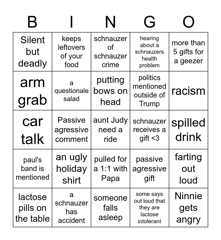 This bingo card has a free space and 29 words: lactose pills on the table, Paul/Marla ask about Disneyland, Passive agressive comment, Chair bump, Silent but deadly, schnauzer of schnauzer crime, a questionale salad, an ugly holiday shirt, schnauzer receives a gift <3, a schnauzer has accident, spilled drink, Ninnie gets angry, someone falls asleep, some says out loud that they are lactose intolerant, racism, trump comment, pulled for a 1:1 with Papa, paul's band is mentioned, more than 5 gifts for a geezer, car talk, passive agressive gift, kitchy gift from Marla and Paul, politics mentioned outside of Trump, arm grab, hearing about a schnauzers health problem, keeps leftovers of your food, farting out loud, putting bows on head and saving ribbons and bows.