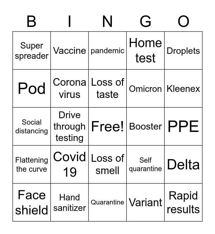 This bingo card has a free space and 24 words: Covid 19, Hand sanitizer, Loss of taste, Face shield, Droplets, Super spreader, Pod, Vaccine, Booster, Loss of smell, Omicron, Social distancing, Self quarantine, Delta, Corona virus, Variant, PPE, pandemic, Kleenex, Drive through testing, Rapid results, Flattening the curve, Home test and Quarantine.