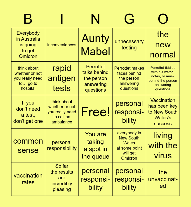 This bingo card has a free space and 24 words: personal responsibility, So far the results are incredibly pleasing, Perrottet talks behind the person answering questions, vaccination rates, the new normal, Everybody in Australia is going to get Omicron, think about whether or not you really need to… go to hospital, inconveniences, personal responsi-bility, You are taking a spot in the queue, Perrottet makes faces behind the person answering questions, If you don’t need a test, don’t get one, everybody in New South Wales at some point will get Omicron, living with the virus, rapid antigen tests, personal responsi-bility, Vaccination has been key to New South Wales's success, Aunty Mabel, Perrottet fiddles with his watch, notes, or mask behind the person answering questions, think about whether or not you really need to call an ambulance, the unvaccinat-ed, common sense, unnecessary testing and personal responsi-bility.