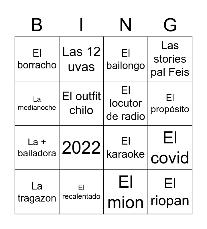 This bingo card has 25 words: Free!, La cruda, El propósito, El brindis, La medianoche, El borracho, El outfit chilo, Las 12 uvas, El recalentado, El tupper, La + bailadora, El karaoke, Los terrenos de la abuela, El conteo, El locutor de radio, El alma de la fiesta, El mion, El bailongo, 2022, El covid, La tragazon, El gimnasio en enero, El riopan, Las stories pal Feis and Los tamales.