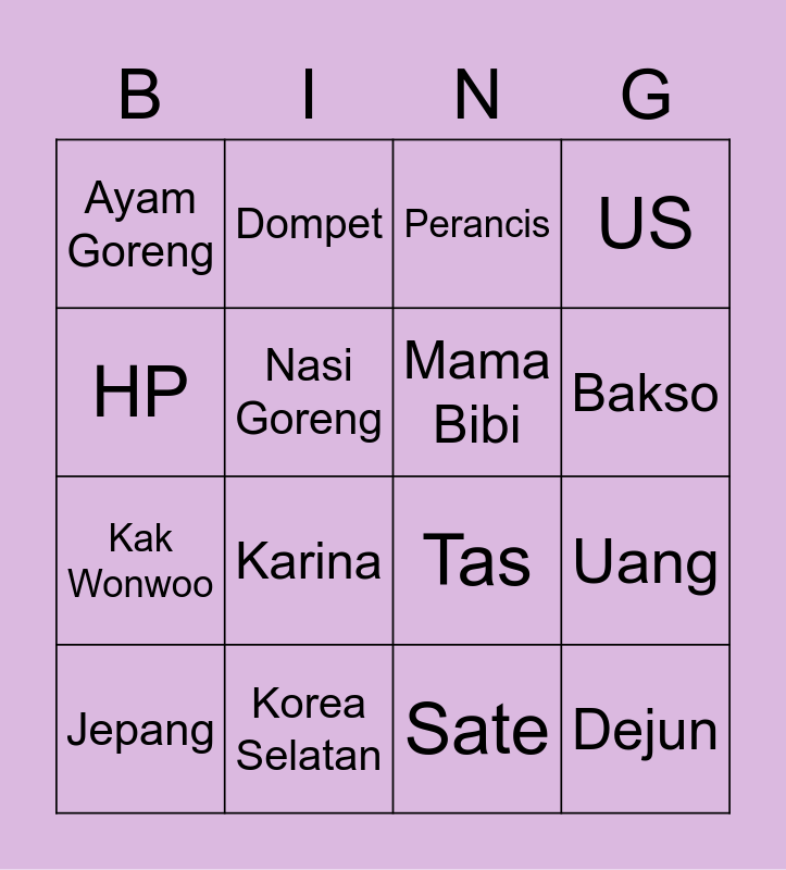 This bingo card has 16 words: Jepang, Korea Selatan, Perancis, US, HP, Dompet, Tas, Uang, Ayam Goreng, Nasi Goreng, Sate, Bakso, Kak Wonwoo, Karina, Mama Bibi and Dejun.