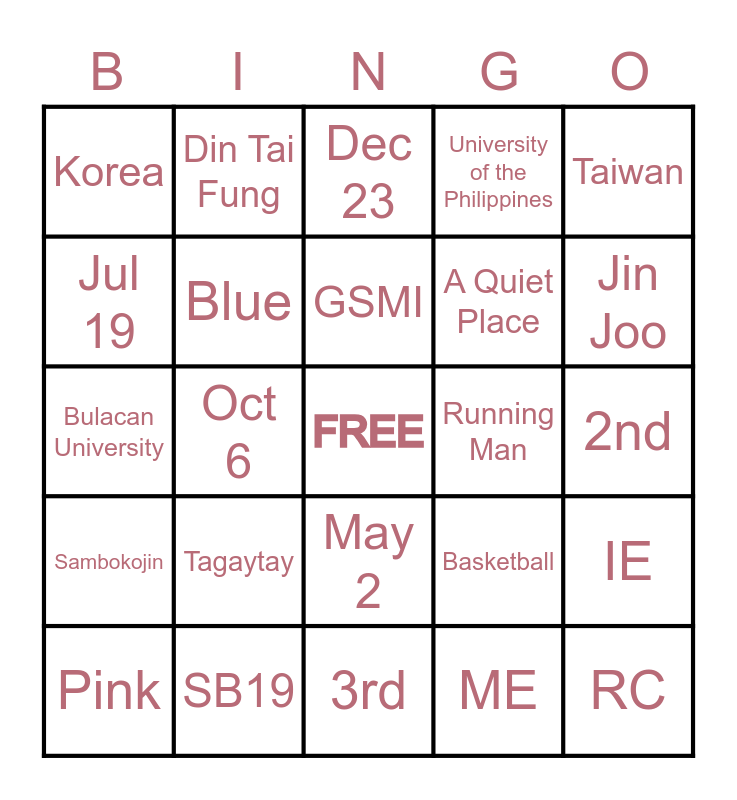 This bingo card has a free space and 24 words: Tagaytay, SB19, GSMI, Pink, Taiwan, Korea, Jul 19, Din Tai Fung, Running Man, May 2, A Quiet Place, Bulacan University, Basketball, IE, Blue, ME, 2nd, Dec 23, Jin Joo, Oct 6, RC, Sambokojin, University of the Philippines and 3rd.