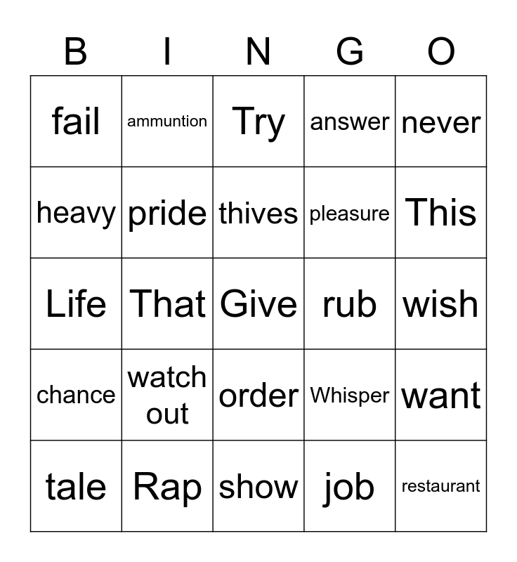 This bingo card has 25 words: watch out, show, thives, tale, never, fail, heavy, ammuntion, rub, order, pleasure, Life, Whisper, want, pride, restaurant, wish, Try, This, That, Give, Rap, chance, answer and job.