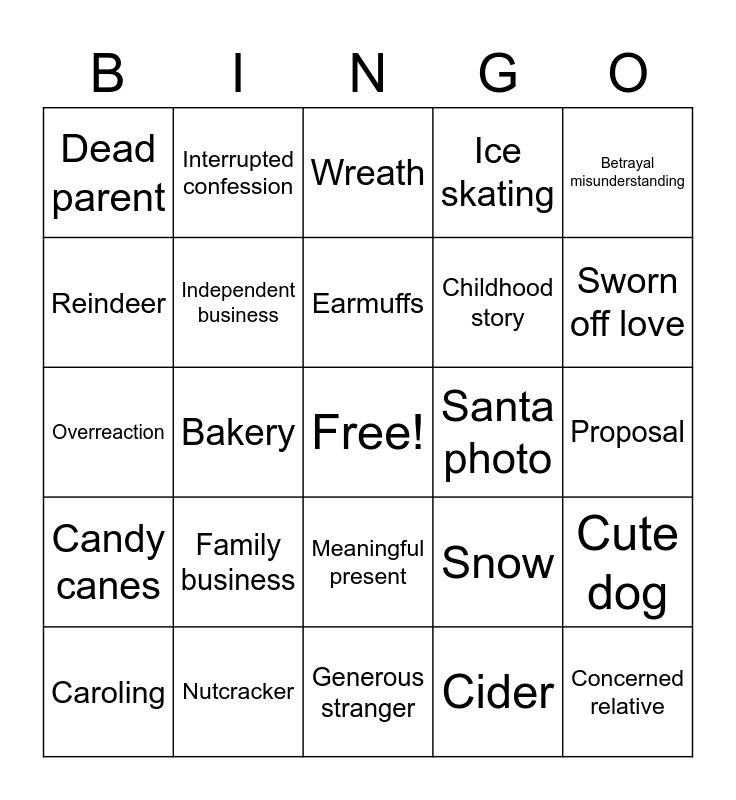 This bingo card has a free space and 25 words: Family business, Generous stranger, Earmuffs, Caroling, Betrayal misunderstanding, Dead parent, Reindeer, Interrupted confession, Santa photo, Meaningful present, Childhood story, Overreaction, Snow, Cute dog, Independent business, Holiday festival, Proposal, Wreath, Sworn off love, Bakery, Concerned relative, Nutcracker, Candy canes, Ice skating and Cider.