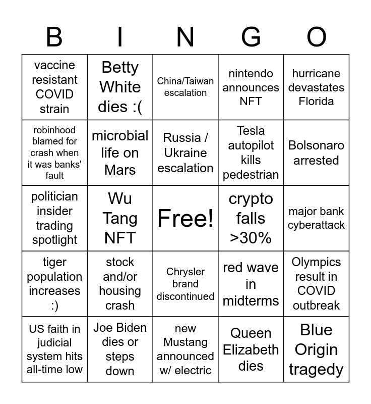 This bingo card has a free space and 24 words: stock and/or housing crash, Joe Biden dies or steps down, Russia / Ukraine escalation, US faith in judicial system hits all-time low, hurricane devastates Florida, vaccine resistant COVID strain, robinhood blamed for crash when it was banks' fault, Betty White dies :(, crypto falls >30%, Chrysler brand discontinued, Tesla autopilot kills pedestrian, politician insider trading spotlight, red wave in midterms, Olympics result in COVID outbreak, microbial life on Mars, Queen Elizabeth dies, major bank cyberattack, China/Taiwan escalation, Bolsonaro arrested, Wu Tang NFT, Blue Origin tragedy, tiger population increases :), nintendo announces NFT and new Mustang announced w/ electric.