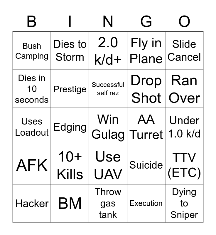 This bingo card has a free space and 24 words: 10+ Kills, BM, Successful self rez, Hacker, Slide Cancel, Bush Camping, Dies in 10 seconds, Dies to Storm, AA Turret, Use UAV, Drop Shot, Uses Loadout, Suicide, TTV (ETC), Prestige, Execution, Under 1.0 k/d, 2.0 k/d+, Ran Over, Edging, Dying to Sniper, AFK, Fly in Plane and Throw gas tank.