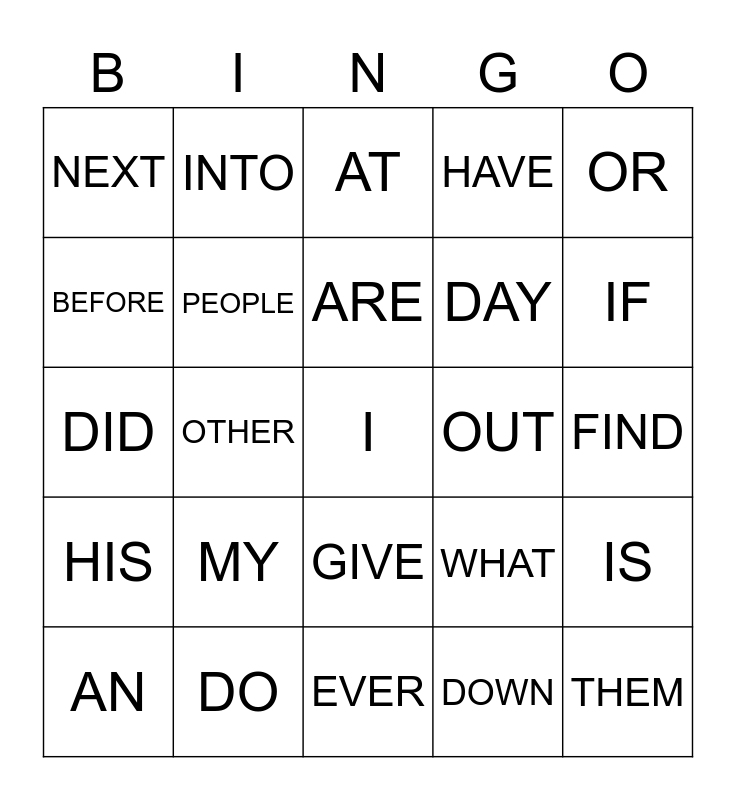 This bingo card has a free space and 24 words: MY, DO, ARE, AN, OR, NEXT, BEFORE, INTO, OUT, GIVE, DAY, DID, WHAT, IS, PEOPLE, DOWN, FIND, AT, IF, OTHER, THEM, HIS, HAVE and EVER.