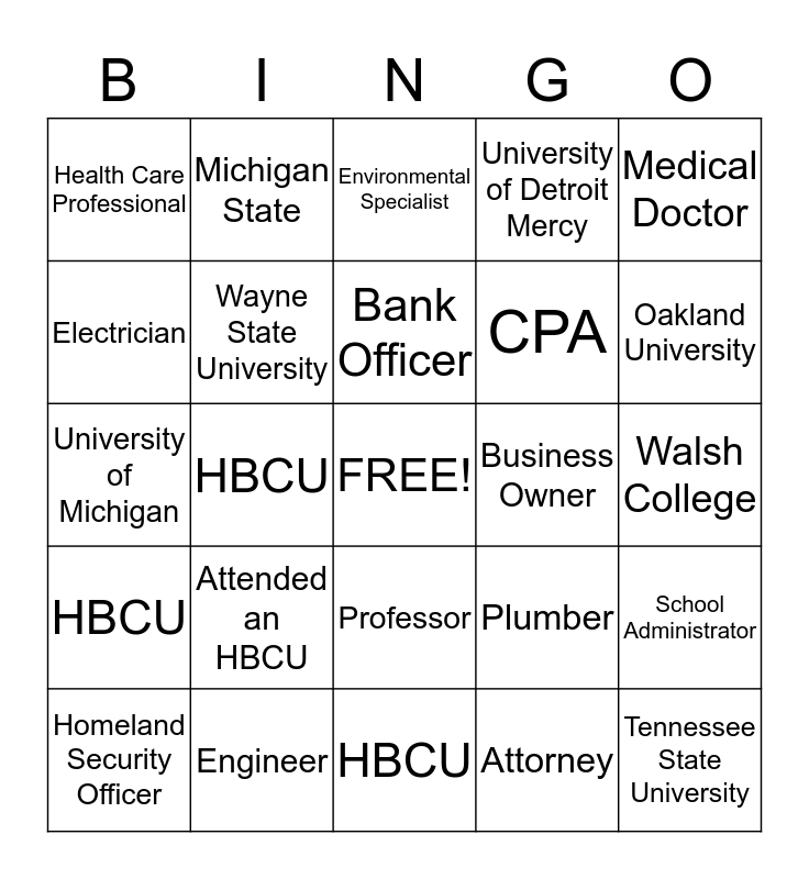This bingo card has a free space and 24 words: Attended an HBCU, Engineer, Bank Officer, Homeland Security Officer, Medical Doctor, Health Care Professional, Electrician, Michigan State, Business Owner, Professor, CPA, University of Michigan, Plumber, School Administrator, Wayne State University, Attorney, Walsh College, Environmental Specialist, Oakland University, HBCU, Tennessee State University, HBCU, University of Detroit Mercy and HBCU.