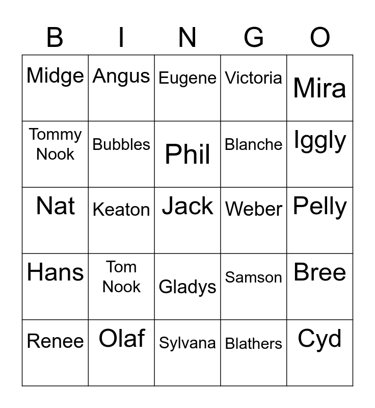 This bingo card has a free space and 24 words: Tom Nook, Olaf, Phil, Renee, Mira, Midge, Tommy Nook, Angus, Weber, Gladys, Blanche, Nat, Samson, Bree, Bubbles, Blathers, Pelly, Eugene, Iggly, Keaton, Cyd, Hans, Victoria and Sylvana.
