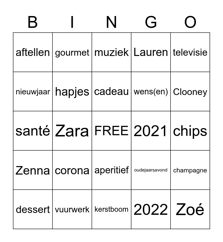 This bingo card has a free space and 24 words: corona, vuurwerk, cadeau, dessert, televisie, aftellen, nieuwjaar, gourmet, 2021, aperitief, wens(en), santé, oudejaarsavond, champagne, hapjes, 2022, chips, muziek, Clooney, Zara, Zoé, Zenna, Lauren and kerstboom.