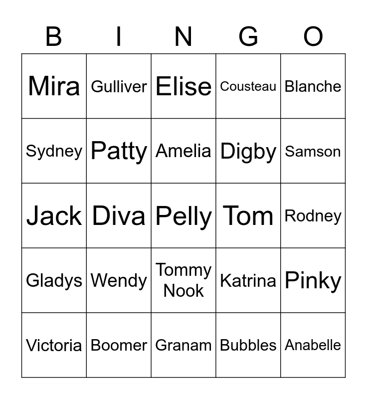 This bingo card has 25 words: Wendy, Granam, Amelia, Victoria, Blanche, Mira, Sydney, Gulliver, Tom, Tommy Nook, Digby, Jack, Katrina, Pinky, Patty, Anabelle, Rodney, Elise, Samson, Diva, Pelly, Boomer, Gladys, Cousteau and Bubbles.