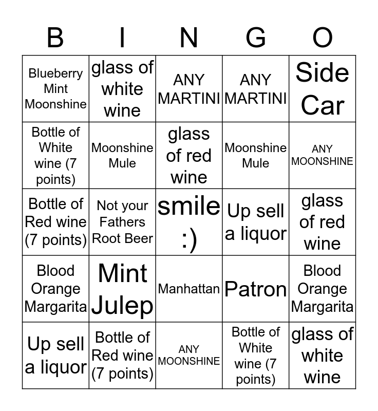 ⚠ This card has duplicate items: glass of red wine (2), Up sell a liquor (2), Bottle of White wine (7 points) (2), glass of white wine (2), Moonshine Mule (2), Blood Orange Margarita (2), ANY MARTINI (2), ANY MOONSHINE (2)