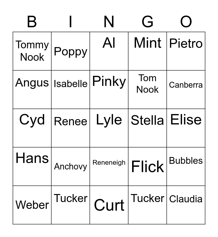 This bingo card has a free space and 24 words: Anchovy, Tucker, Pinky, Weber, Pietro, Tommy Nook, Angus, Poppy, Stella, Reneneigh, Tom Nook, Cyd, Flick, Bubbles, Isabelle, Tucker, Elise, Al, Canberra, Renee, Claudia, Hans, Mint and Curt.
