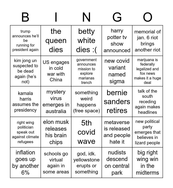 This bingo card has a free space and 24 words: elon musk releases his brain chips, schools go virtual again in some areas, government announces mission to explore marianas trench, inflation goes up by another 6%, memorial of jan. 6 riot brings another riot, trump announces he’ll be running for president again, kim jong un suspected to be dead again (he’s not), the queen dies, bernie sanders retires, 5th covid wave, new covid variant named sigma, kamala harris assumes the presidency, metaverse is released and people hate it, new political party emerges that believes in lizard people, US engages in cold war with China, nudists descend on central park, talk of the south receding again makes headlines, betty white dies :(, marijuana is federally legalized and fox news makes it a huge deal, mystery virus emerges in australia, big right wing win in the midterms, right wing politician speak out against climate refugees, harry potter tv show announced and god, idk. yellowstone erupts or something.