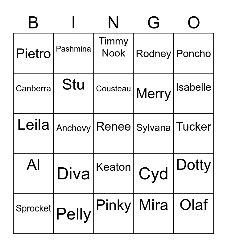 This bingo card has a free space and 24 words: Diva, Pelly, Cousteau, Sprocket, Poncho, Pietro, Canberra, Pashmina, Sylvana, Keaton, Merry, Leila, Cyd, Dotty, Stu, Mira, Tucker, Timmy Nook, Isabelle, Anchovy, Olaf, Al, Rodney and Pinky.