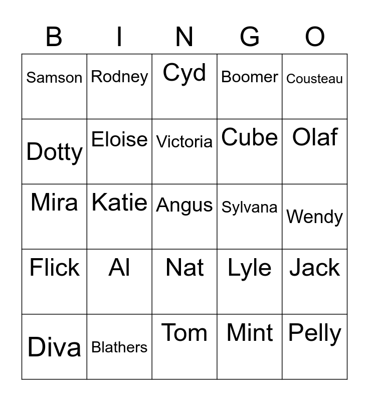 This bingo card has a free space and 24 words: Al, Blathers, Victoria, Diva, Cousteau, Samson, Dotty, Rodney, Sylvana, Nat, Cube, Mira, Lyle, Jack, Eloise, Mint, Wendy, Cyd, Olaf, Katie, Pelly, Flick, Boomer and Tom.