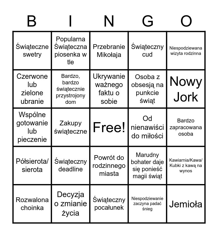 This bingo card has a free space and 24 words: Świąteczny deadline, Decyzja o zmianie życia, Ukrywanie ważnego faktu o sobie, Rozwalona choinka, Niespodziewana wizyta rodzinna, Świąteczne swetry, Czerwone lub zielone ubranie, Popularna Świąteczna piosenka w tle, Od nienawiści do miłości, Powrót do rodzinnego miasta, Osoba z obsesją na punkcie świąt, Wspólne gotowanie lub pieczenie, Marudny bohater daje się ponieść magii świąt, Kawiarnia/Kawa/ Kubki z kawą na wynos, Bardzo, bardzo świątecznie przystrojony dom, Niespodziewanie zaczyna padać śnieg, Bardzo zapracowana osoba, Przebranie Mikołaja, Nowy Jork, Zakupy świąteczne, Jemioła, Półsierota/ sierota, Świąteczny cud and Świąteczny pocałunek.