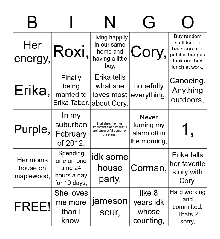 This bingo card has 29 words: FREE!, She’s always been apart of my life and always will be,, In my suburban February of 2012,, Hard working and committed. Thats 2 sorry,, Her energy,, Living happily in our same home and having a little boy,, Finally being married to Erika Tabor,, Spending one on one time 24 hours a day for 10 days,, Never turning my alarm off in the morning,, She loves me more than I know,, 1,, That she’s the most important.smart.beautiful and successful person on the planet,, jameson sour,, like 8 years idk whose counting,, Canoeing. Anything outdoors,, clear…….and purple,, idk some house party,, Her moms house on maplewood,, Buy random stuff for the back porch or put it in her gas tank and buy lunch at work,, Purple,, Corman,, Jayne,, hopefully everything,, Erika,, Cory,, Roxi,, Erika tells her favorite story with Cory,, Erika tells what she loves most about Cory, and Erika tells the story about the proposal.