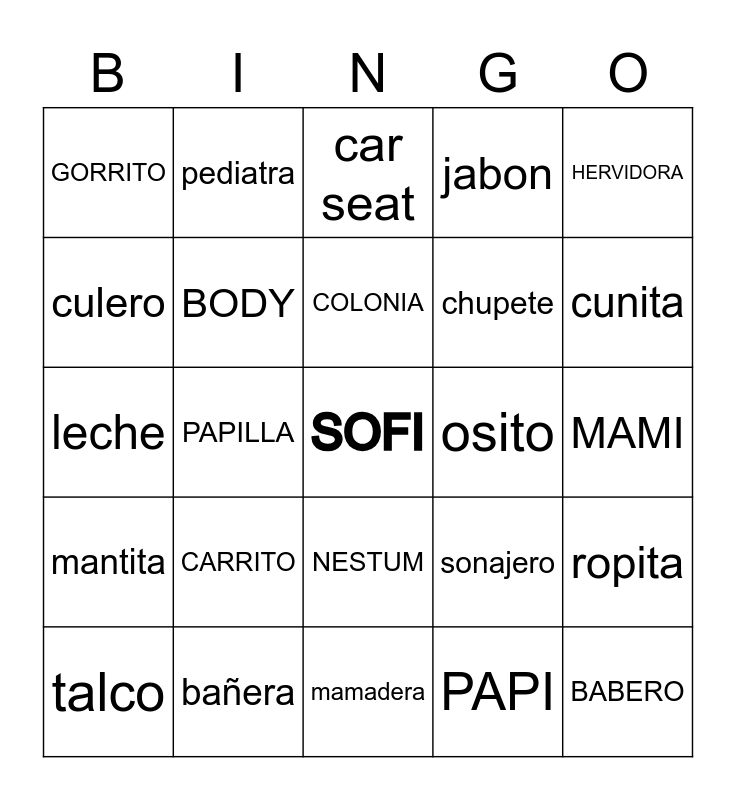 This bingo card has a free space and 27 words: sonajero, pañal, chupete, mamadera, culero, car seat, pediatra, mantita, osito, ropita, leche, jabon, talco, bañera, cunita, almohadita, BODY, COLONIA, CARRITO, GORRITO, MAMI, PAPI, PAPILLA, BABERO, NESTUM, HERVIDORA and OMBLIGUERO.