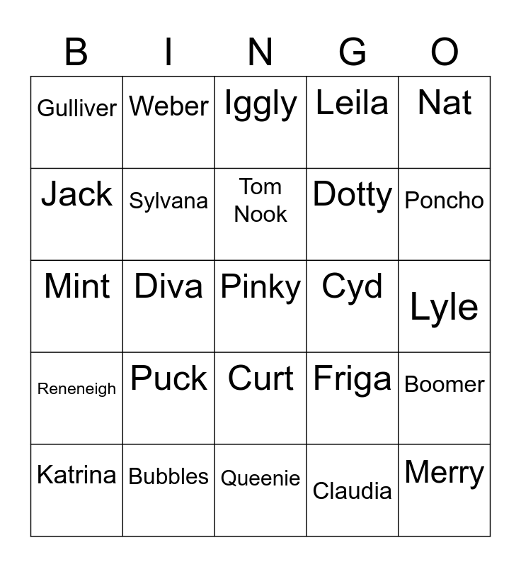 This bingo card has a free space and 24 words: Puck, Bubbles, Tom Nook, Katrina, Nat, Gulliver, Jack, Weber, Cyd, Curt, Dotty, Mint, Friga, Boomer, Sylvana, Claudia, Lyle, Iggly, Poncho, Diva, Merry, Reneneigh, Leila and Queenie.