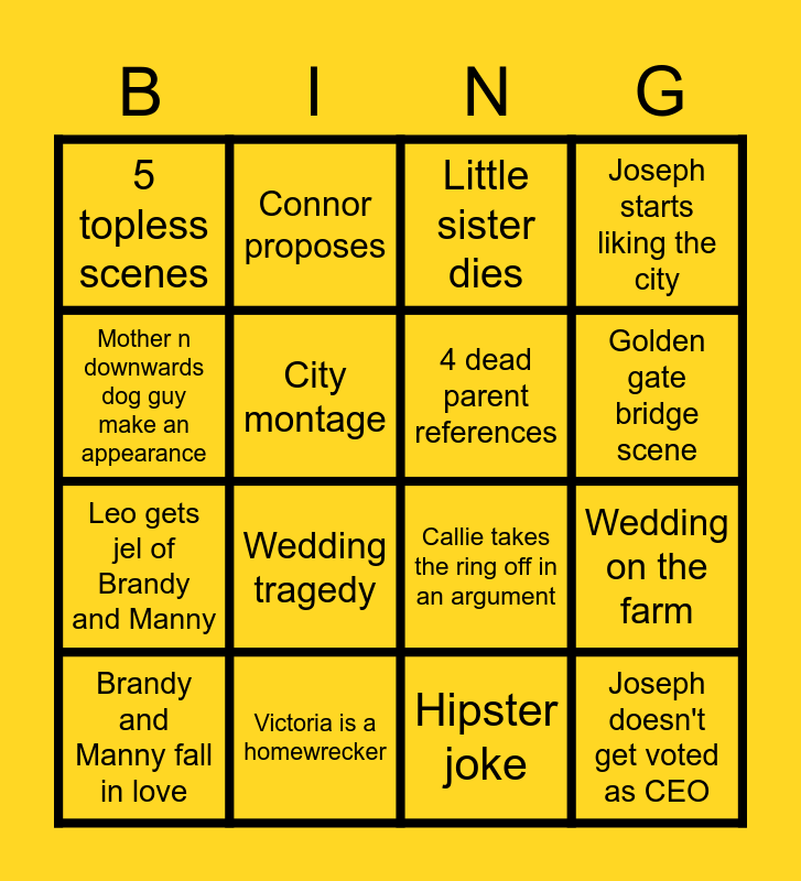 This bingo card has 16 words: Brandy and Manny fall in love, Victoria is a homewrecker, Little sister dies, Joseph starts liking the city, Mother n downwards dog guy make an appearance, Connor proposes, Callie takes the ring off in an argument, Wedding on the farm, 5 topless scenes, City montage, Hipster joke, Golden gate bridge scene, Leo gets jel of Brandy and Manny, Wedding tragedy, 4 dead parent references and Joseph doesn't get voted as CEO.