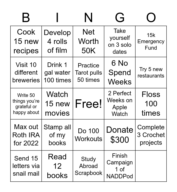 This bingo card has a free space and 24 words: Max out Roth IRA for 2022, Read 12 books, Do 100 Workouts, Donate $300, 15k Emergency Fund, Cook 15 new recipes, Develop 4 rolls of film, Net Worth 50K, 6 No Spend Weeks, Complete 3 Crochet projects, Visit 10 different breweries, Drink 1 gal water 100 times, Go on 10 hikes, 2 Perfect Weeks on Apple Watch, Try 5 new restaurants, Send 15 letters via snail mail, Watch 15 new movies, Practice Tarot pulls 50 times, Take yourself on 3 solo dates, Floss 100 times, Write 50 things you’re grateful or happy about, Stamp all of my books, Study Abroad Scrapbook and Finish Campaign 1 of NADDPod.
