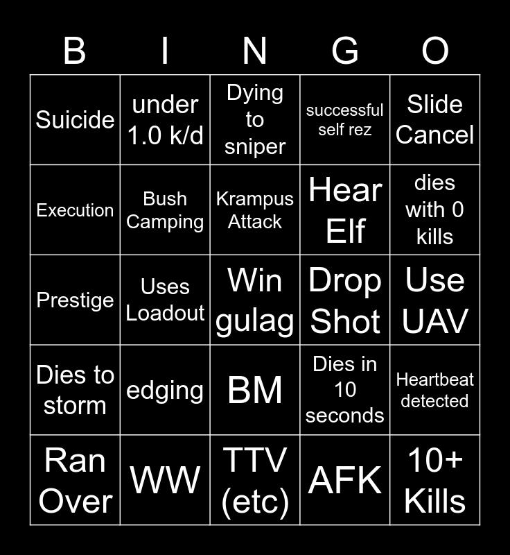 This bingo card has a free space and 24 words: edging, WW, Krampus Attack, Ran Over, Slide Cancel, Suicide, Execution, under 1.0 k/d, Drop Shot, BM, Hear Elf, Prestige, Dies in 10 seconds, Heartbeat detected, Bush Camping, AFK, Use UAV, Dying to sniper, dies with 0 kills, Uses Loadout, 10+ Kills, Dies to storm, successful self rez and TTV (etc).