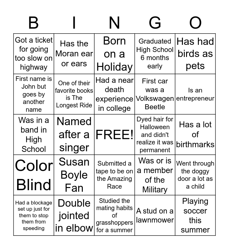 This bingo card has a free space and 24 words: Susan Boyle Fan, Double jointed in elbow, Had a near death experience in college, Had a blockage set up just for them to stop them from speeding, Has had birds as pets, Got a ticket for going too slow on highway, First name is John but goes by another name, Has the Moran ear or ears, Dyed hair for Halloween and didn't realize it was permanent, Submitted a tape to be on the Amazing Race, First car was a Volkswagen Beetle, Was in a band in High School, Was or is a member of the Military, Went through the doggy door a lot as a child, One of their favorite books is The Longest Ride, A stud on a lawnmower, Has a lot of birthmarks, Born on a Holiday, Is an entrepreneur, Named after a singer, Playing soccer this summer, Color Blind, Graduated High School 6 months early and Studied the mating habits of grasshoppers for a summer.