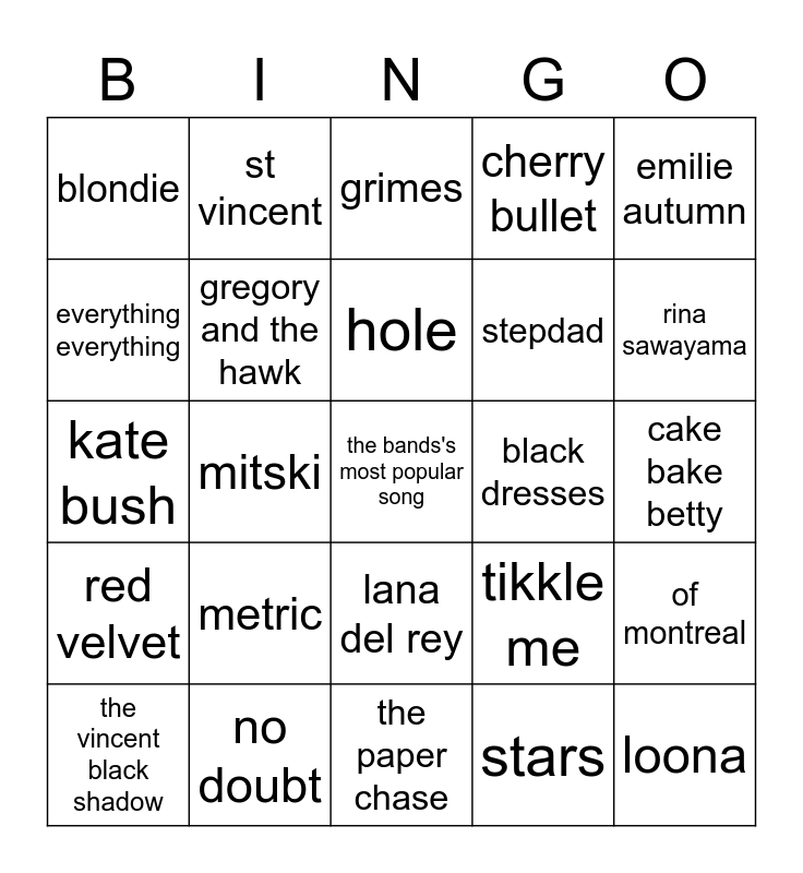 This bingo card has a free space and 24 words: metric, no doubt, hole, the vincent black shadow, emilie autumn, blondie, everything everything, st vincent, black dresses, lana del rey, stepdad, kate bush, tikkle me, of montreal, gregory and the hawk, stars, cake bake betty, grimes, rina sawayama, mitski, loona, red velvet, cherry bullet and the paper chase.