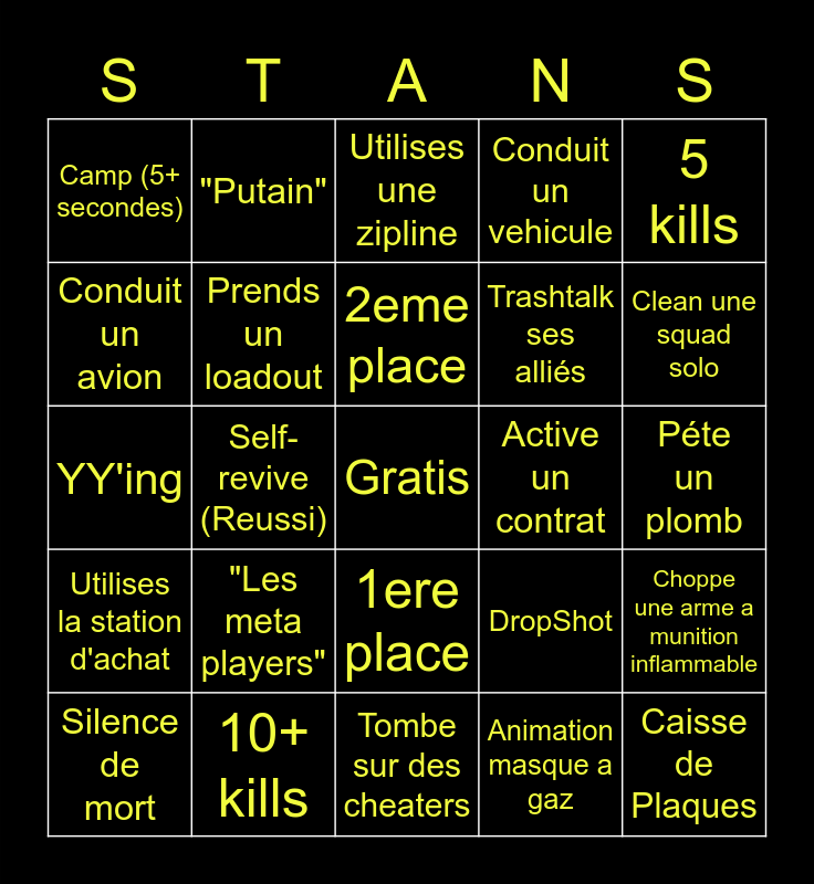 This bingo card has a free space and 35 words: Stans fait un kill, Sniper kill, Utilises son parachute, Prends un loadout, 1ere place, Conduit un vehicule, Conduit un avion, Caisse de munitions, 2eme place, Utilises un Killstreak, YY'ing, 5 kills, Exploses avec un vehicule, Kill par equipement, Camp (5+ secondes), Active un contrat, Animation masque a gaz, Self-revive (Reussi), Utilises la station d'achat, Caisse de Plaques, DropShot, Silence de mort, Choppe une arme a munition inflammable, 10+ kills, Utilises une zipline, Clean une squad solo, Suicide, Lèches la zone (10+ secondes), Trashtalk ses alliés, Péte un plomb, Met la faute sur les cheat, Tombe sur des cheaters, "Les meta players", "Putain" and "Ou il est".