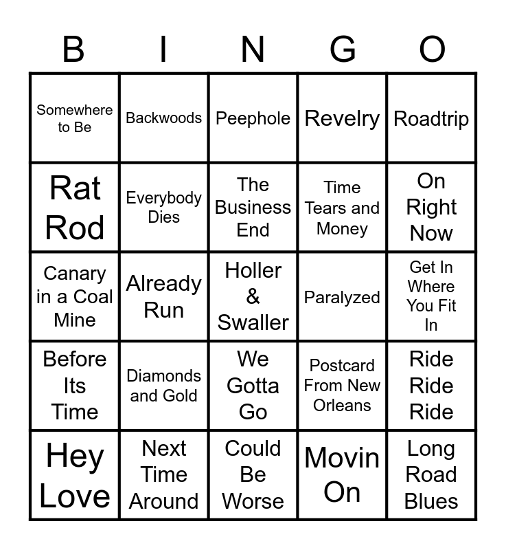 This bingo card has a free space and 38 words: State Sublime, Man of the Cloth, BYOB, Everybody Dies, Ride Ride Ride, Diamonds and Gold, The Business End, Worthless Pride, Roadtrip, Time Tears and Money, Already Run, Revelry, Long Road Blues, Get In Where You Fit In, Rat Rod, Before Its Time, Maybe Someday, Peephole, Mulberry Mountain, Paralyzed, Somewhere to Be, Next Time Around, On Right Now, Hey Love, Lucky Me, Could Be Worse, Money on the Line, Ain't Gonna Work, Falling Line, Parks Closed, If I Were You, We Gotta Go, Movin On, Backwoods, Half Way Home, Postcard From New Orleans, Canary in a Coal Mine and Love is a Dangerous Game.
