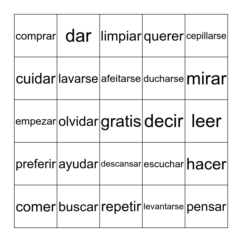 This bingo card has a free space and 24 words: ayudar, buscar, afeitarse, comer, cepillarse, comprar, cuidar, dar, decir, descansar, ducharse, empezar, escuchar, hacer, lavarse, levantarse, leer, limpiar, mirar, olvidar, pensar, preferir, querer and repetir.