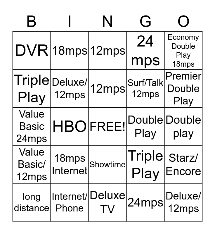 This bingo card has a free space and 24 words: 18mps Internet, Internet/ Phone, 12mps, long distance, Economy Double Play 18mps, DVR, Triple Play, 18mps, Double Play, Showtime, Surf/Talk 12mps, Value Basic 24mps, Triple Play, Starz/ Encore, Deluxe/ 12mps, 24mps, Double play, 12mps, Premier Double Play, HBO, Deluxe/ 12mps, Value Basic/ 12mps, 24 mps and Deluxe TV.